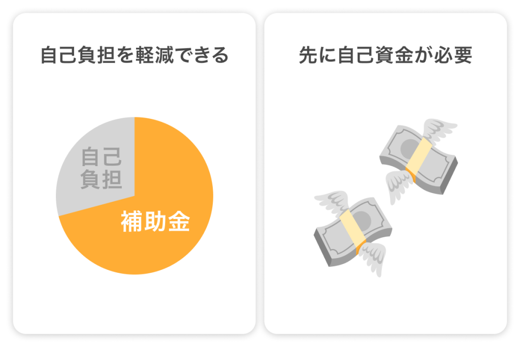 ただし補助金は「後払い」が原則です。まずは自分で費用を支出し、その後に補助金として戻ってくる仕組みになっています。そのため、先に現金を用意できるかどうかが利用の前提になります。
