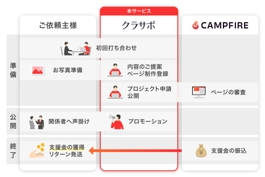 ご依頼主・当サイト・CAMPFIREの関わり方を、具体的に可視化したフロー図です。